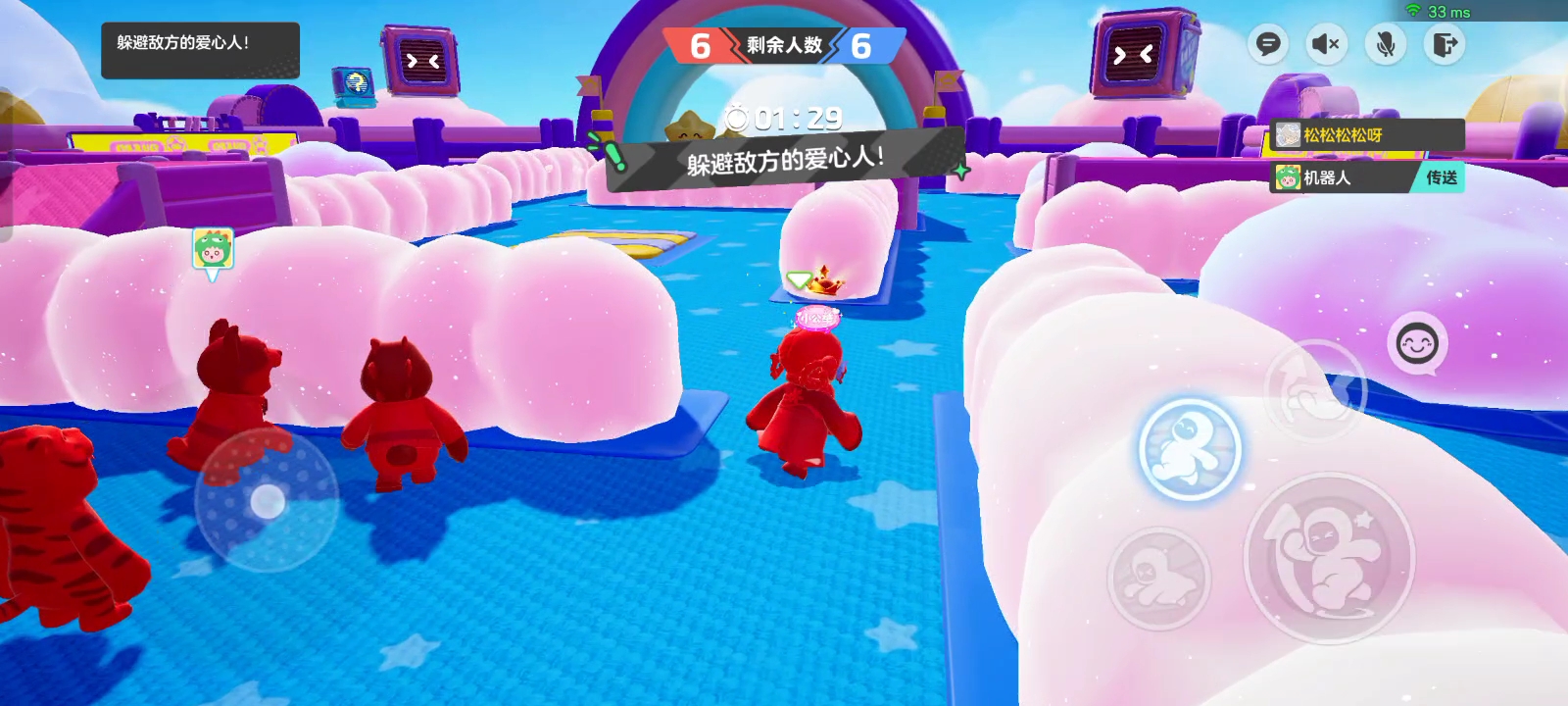 想要躲避对手,不被贴上爱心的话,星宝可以利用场地上这些蓬蓬松松的云朵,躲进云朵后对方小队的成员就看不到你啦~(*^▽^*)