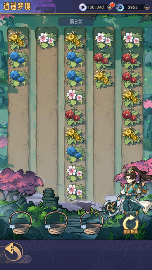 一共有五条路上的不同鲜花,玩家需要一次性将同一种鲜花放到3个篮子里面,每次只能选择一条道路上的头一束花