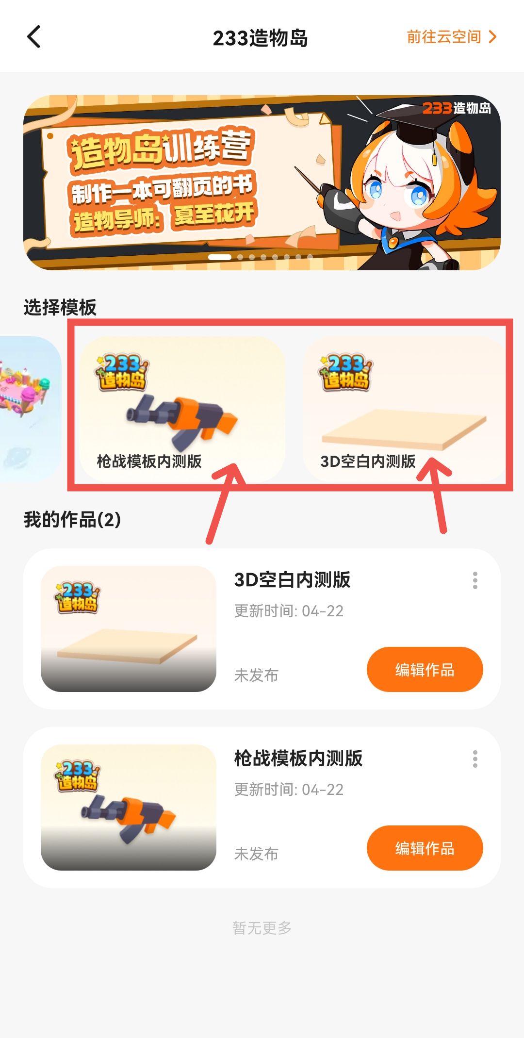 进入造物岛建造页面→选择3D空白内测版和枪战模板内测版模板哦!!