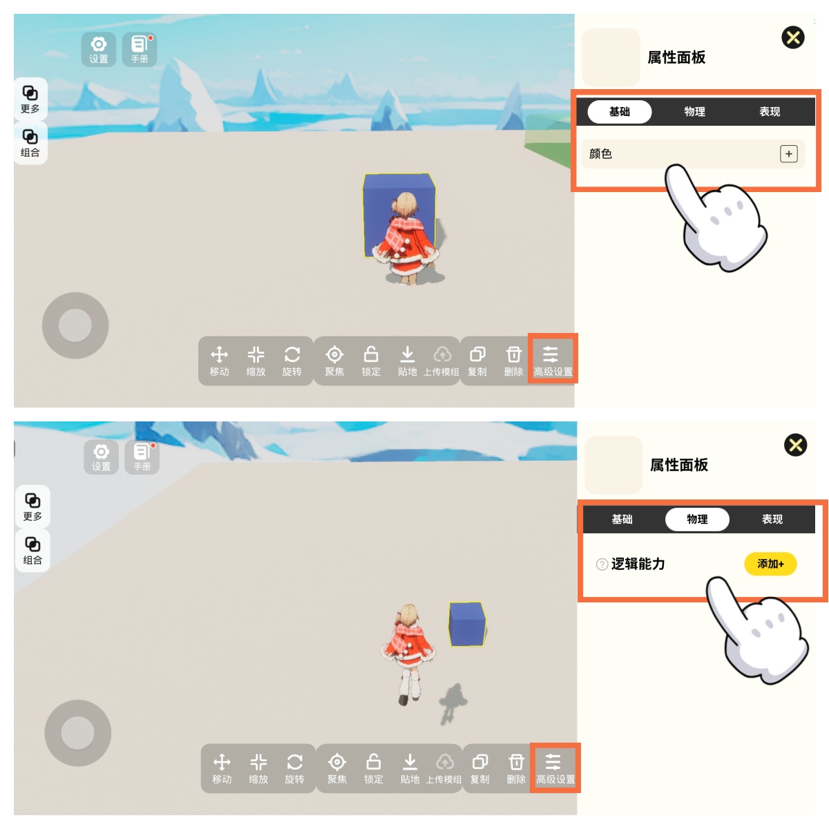 屏幕下方功能栏选择【高级设置】,界面分为基础(改色、改材质)、物理(逻辑能力)、表现(待后续更新)~