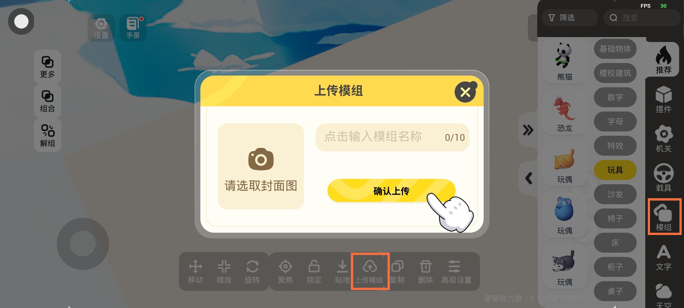 选中物体进行组合,在下方或右侧功能栏【模组】功能进行上传,等待审核通过后就可以让其他玩家在自己的作品内使用你上传的模组哦~