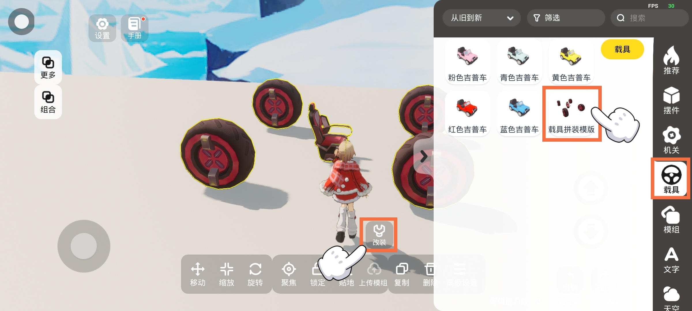 注意~是需要在改装界面进行拼装,不可以对物体和载具拼装模板进行组合哦