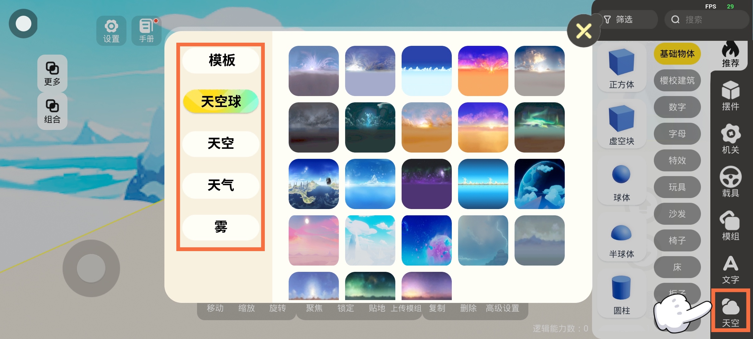 在右侧功能栏选择【天空】功能,新增多款天空模板,还可自定义设置【天空】、【天气】、【雾】,创造独一无二的天空效果!