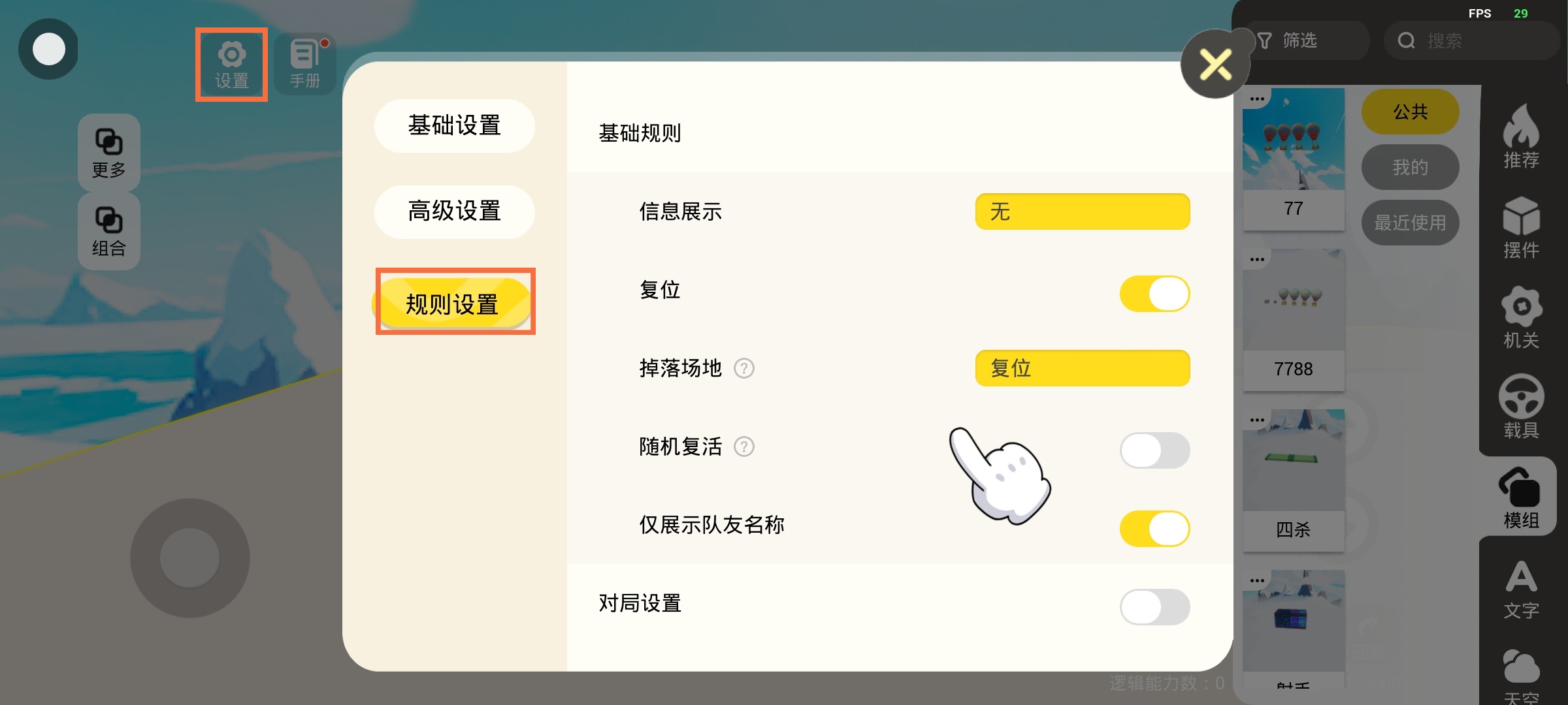 屏幕左上角选择【设置-规则设置】,包括基础/时间/积分/击败规则、对局设置,大家可以摸索尝试哦~