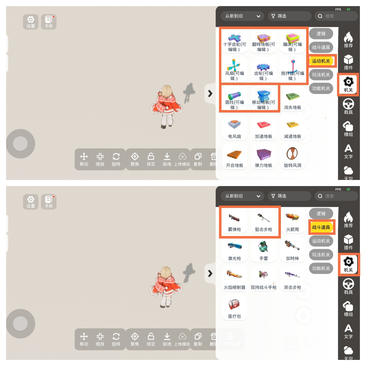 ②运动机关:新增十字齿轮、翻转地板、蹦床、风扇、齿轮、搅拌器、圆柱、移动地板(均可到高级设置-机关属性对机关进行设置哦~)