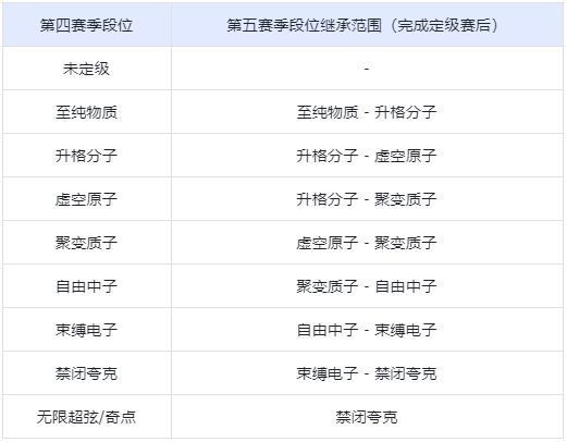 第五赛季开启后,引航者将需要重新通过定级赛来确定第五赛季的初始段位,并且在第四赛季已经获得段位的引航者仅需1场定级赛即可确定新赛季段位,第五赛季的初始段位将会根据第四赛季的段位、生涯表现以及定级赛综合确定,具体结算引航者可以根据下表进行对照: