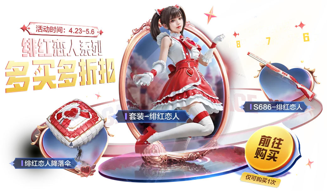 4月23日-5月6日活动期间,特种兵们在活动界面可购买绯红恋人系列外观:S686-绯红恋人、套装-绯红恋人、绯红恋人降落伞,购买1件8折,2件7折,3件6折,注意仅限购买1次哦~