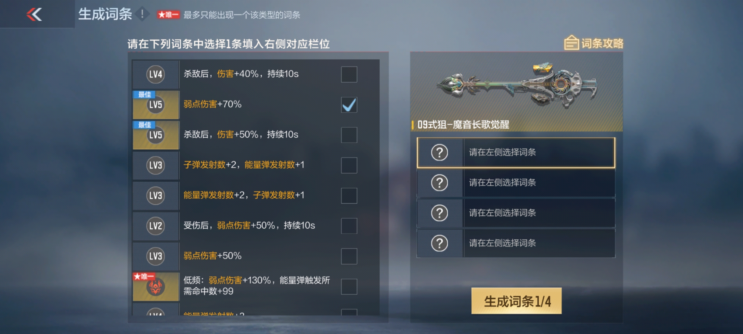 09式狙-魔音长歌觉醒可生成的词条众多,最多只能出现一个该类型的词条有四个:弱点伤害+130%,能量弹触发所需命中数+99、子弹发射数+6、能量弹发射数+5,伤害+30%和能量弹触发所需命中数-3。
