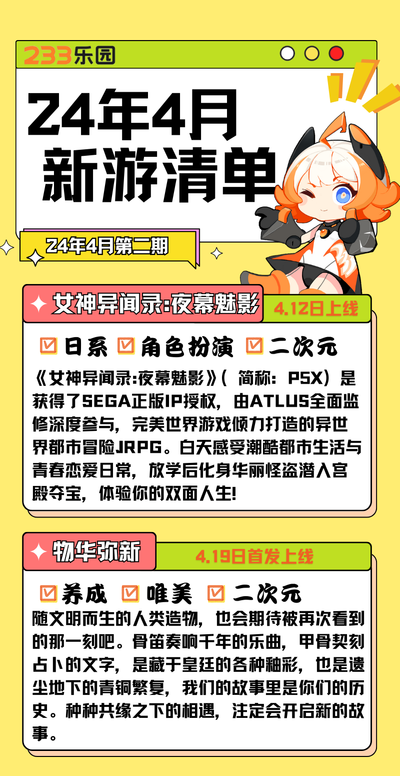 本期精彩新游的介绍到此结束咯,回回神啦,小伙伴们都掉进那个游戏卡片里啦,是迫不及待进入了《女神异闻录:夜幕魅影》的双面人生,还是一返《物华弥新》的千年盛宴,要是晓霜的话,一定是掉进异世界转生成成史莱姆啦,有没有小伙伴会想给一只史莱姆换装呢