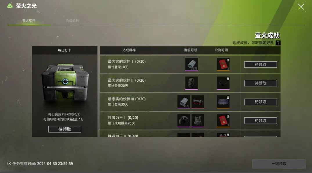 同时,在公测冲刺阶段,完成登录、撤离等一系列成就任务,还能赢取双重回馈!现在就能领,公测也还能领,双重好礼!
