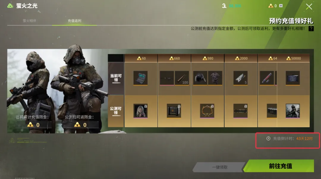 在公测正式开启时,我们将根据萤火虫们在公测冲刺阶段的累计充值金额,为大家送上超值的返还福利!枪皮、背包、皮肤、时装等,各位到时别忘了来领取!
