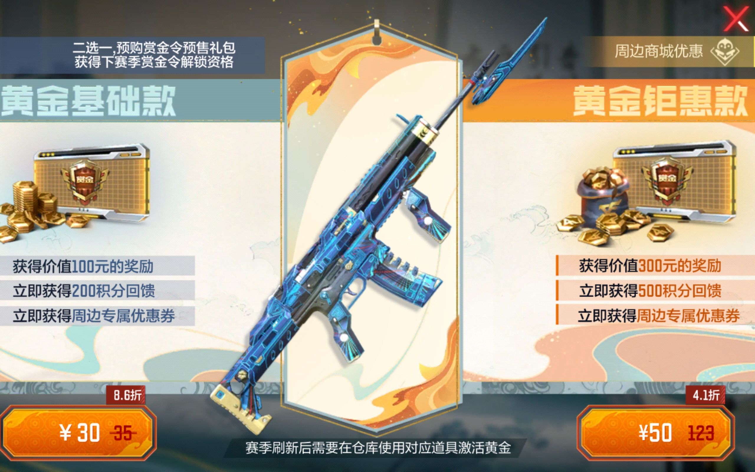 S2过载纪元赏金令预售的大门将在4月23日敞开!预售期间,玩家前往赏金令-预购页面,即可选择心仪的理财卡或者预购黄金。而预购黄金为大家准备了两种预售包:30元的黄金基础款和50元的黄金钜惠款。每一款都蕴藏着丰富的奖励,等待你们来挖掘!