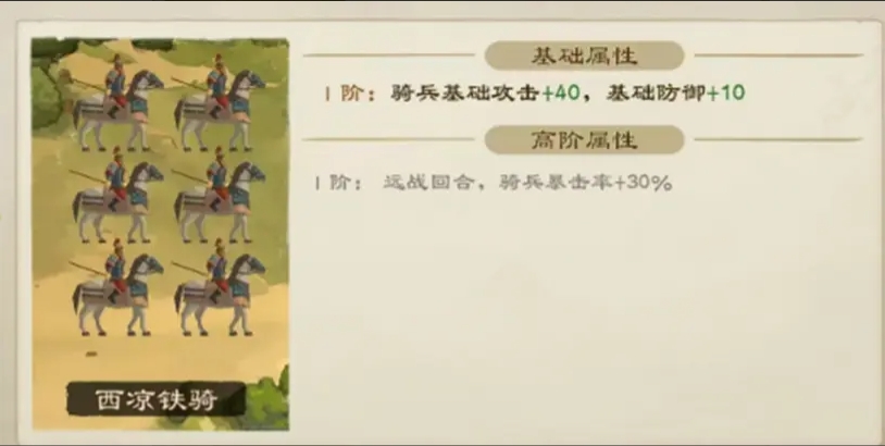 2、西凉铁骑:40攻10防远战阶段,骑兵暴击率+30%,适合纯前军兵种将