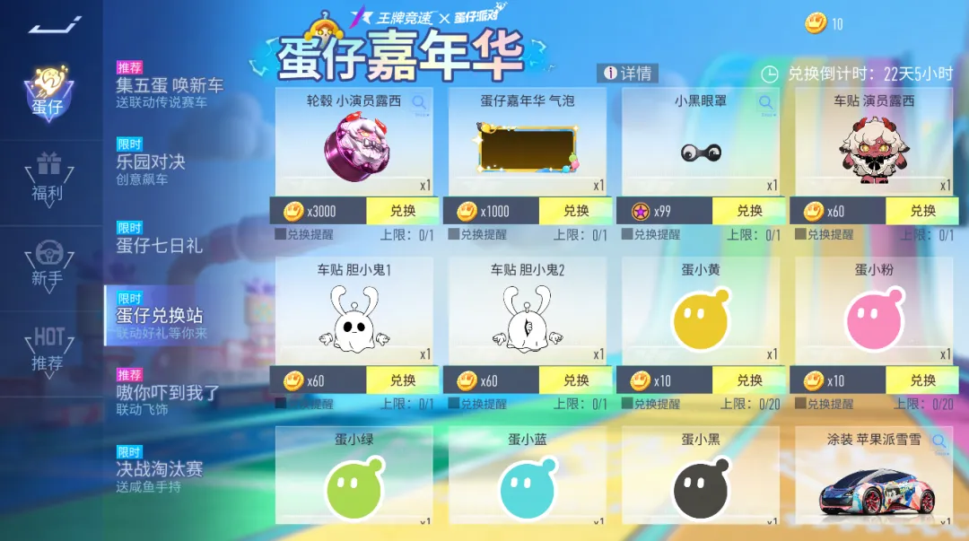[3] 集五蛋 唤新车:4月30日~5月23日,蛋仔来到速度节啦,不同玩法随机掉落小蛋仔道具,集齐五位蛋仔赛车手即可召唤一次,每次均有概率直接获得联动赛车 蛋仔出击!