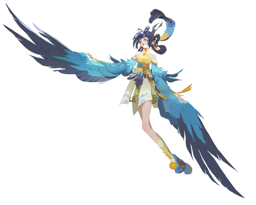 我们简化了精卫的配色,仅保留了黄与蓝,让她在战场中成为更独树一帜的存在。而她的服饰则融入了更多国风元素与细节,通过组合羽毛、树枝、海浪等元素,将那个填海的小精卫呈现到大家面前~