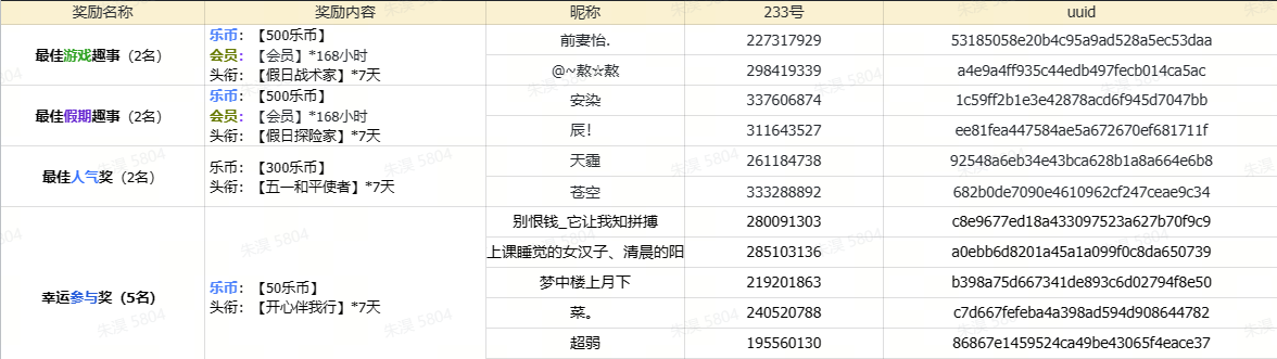 幸运参与奖(10名):活动结束后,将从所有符合要求的帖子中随机抽取若干名幸运玩家,赠送乐园限定头衔【开心伴我行】、乐币*50