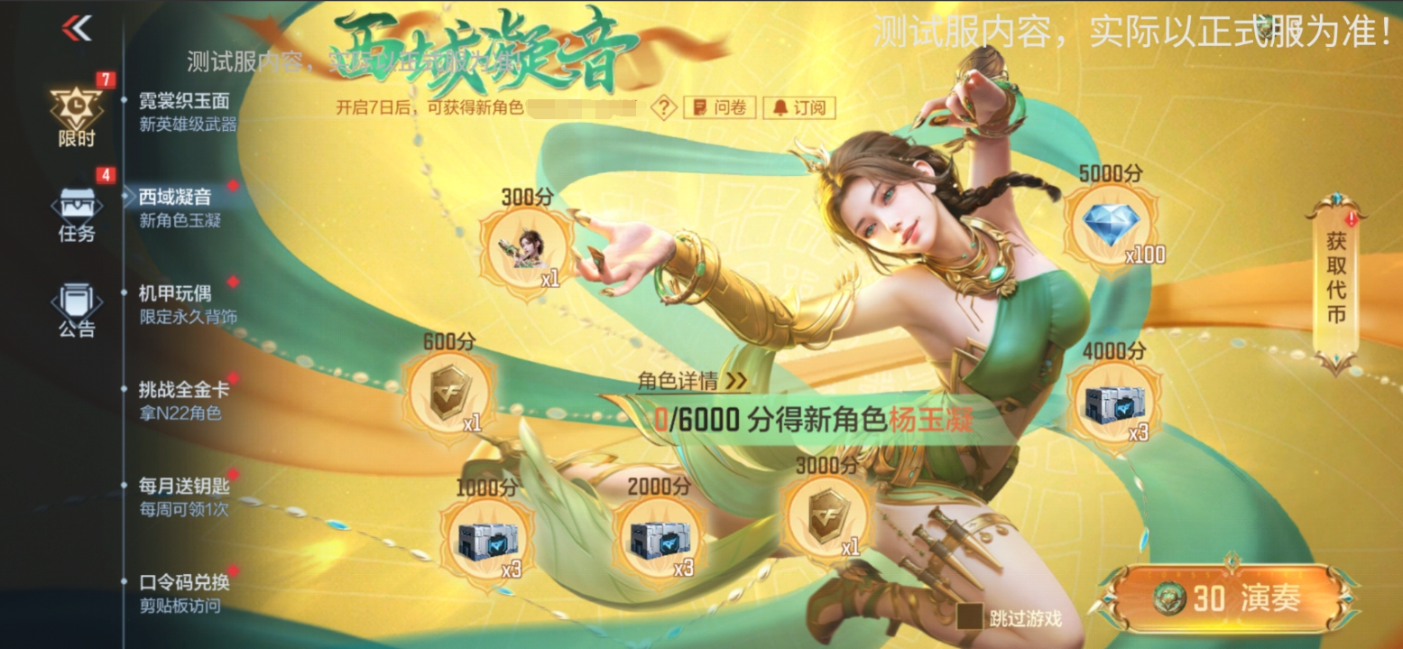 西域凝音活动将在4月26日随新版本上线,请大家前往“限时活动”参与。活动期间,大家需要通过完成任务获得游戏次数,消耗游戏次数可进行演奏,每次演奏都能获得一定数量的积分,总积分累计到一定阶段时能够解锁对应的道具奖励,终极奖励为全新角色杨玉凝。