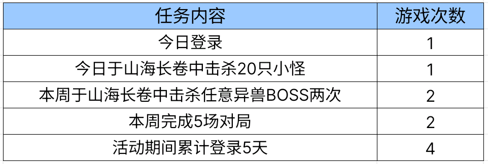 活动任务基本和参与山海经模式,以及登录游戏相关。以下是各项任务对应的游戏次数,请大家自行预览。如果觉得击杀BOSS有难度的话,可以先花点时间提升局内战力等级,或者找大佬带一带。
