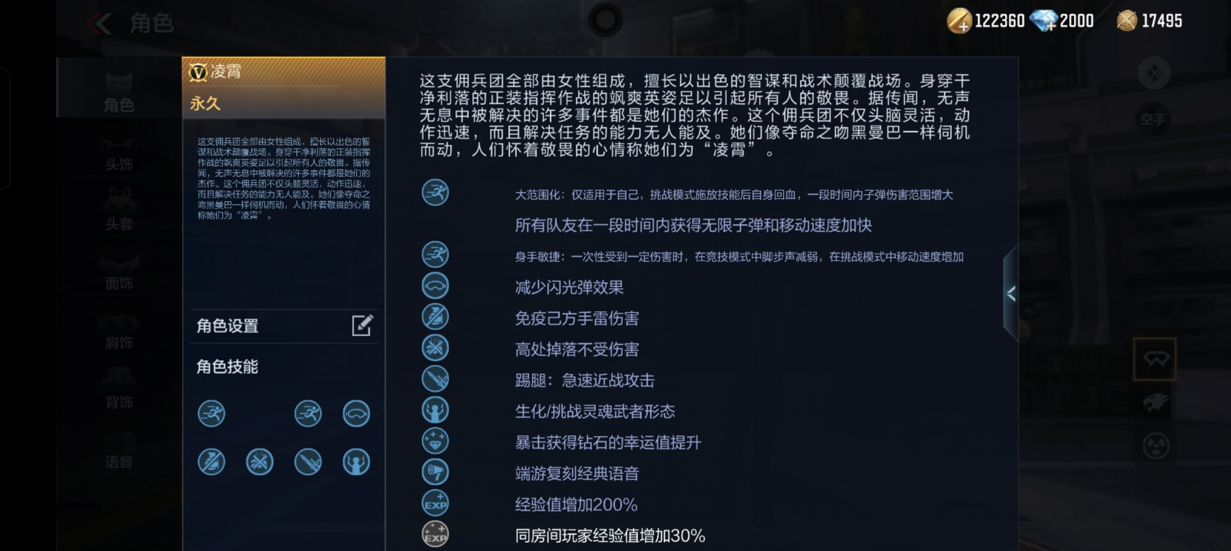 不过凌霄和往期推出的赏金令角色属性上略有不同,相同的是,凌霄和其他的赏金令角色都是“三防”角色(这里三防角色指的是拥有免疫己方手雷、高处掉落不受伤害和减少闪光弹效果三种技能的角色),都拥有经验金币加成。同时作为经典英雄级角色,凌霄也拥有紧急近战踢腿。