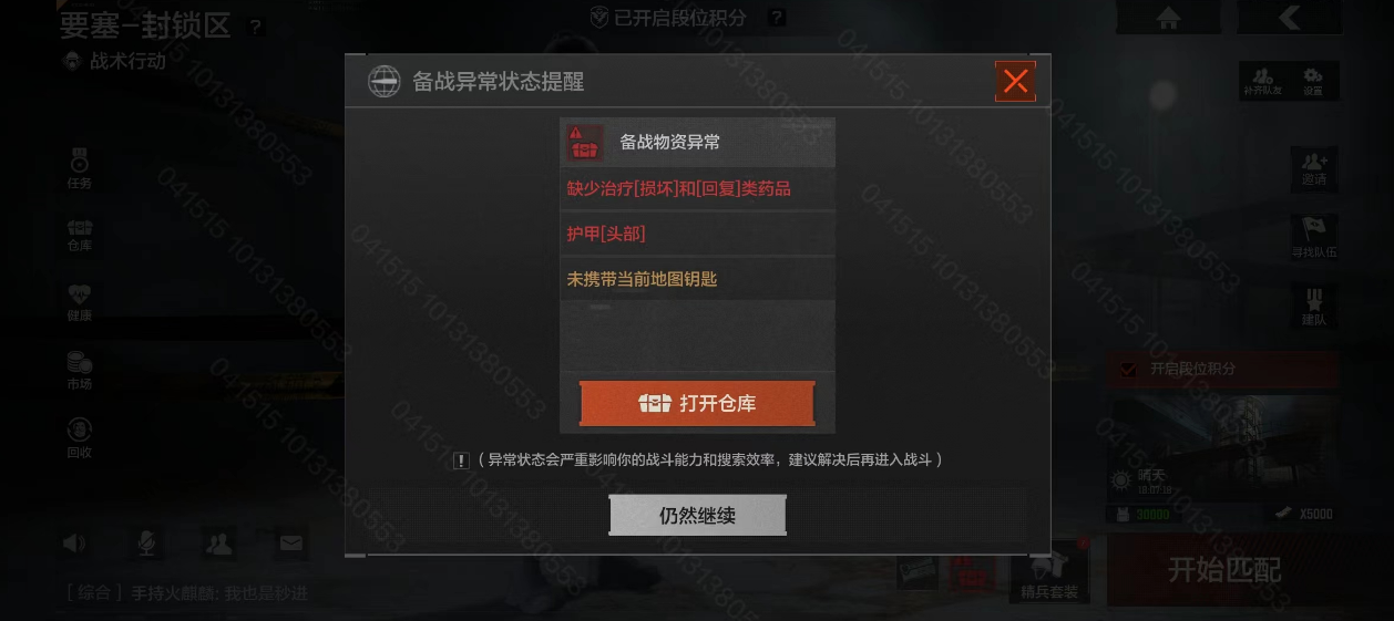 战前检测系统优化了提醒界面,新增加了未携带对应地图钥匙的提醒选项,先锋们可配置常用地图的钥匙方案,在战前检测提醒后进入仓库一键更换钥匙方案。