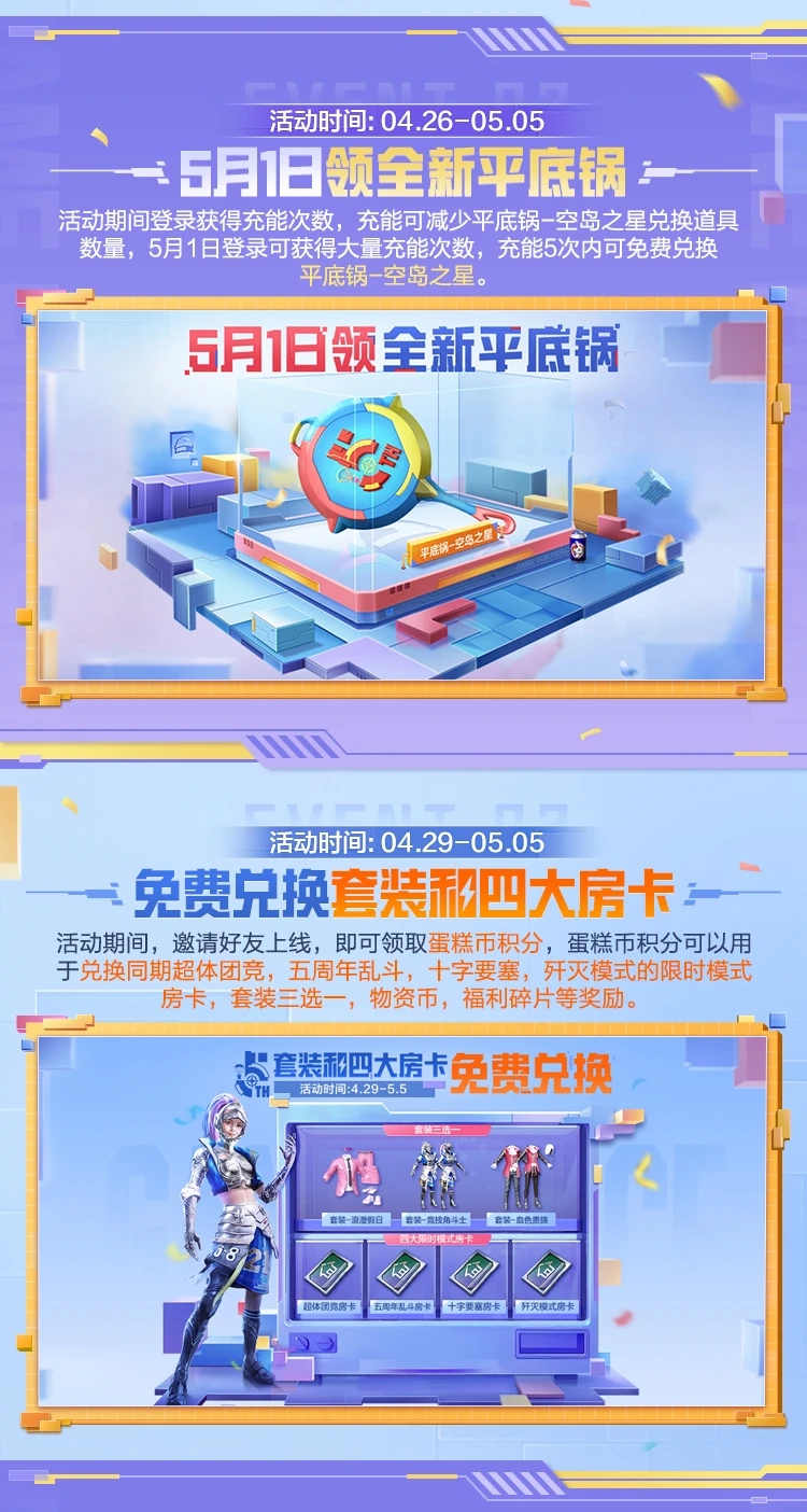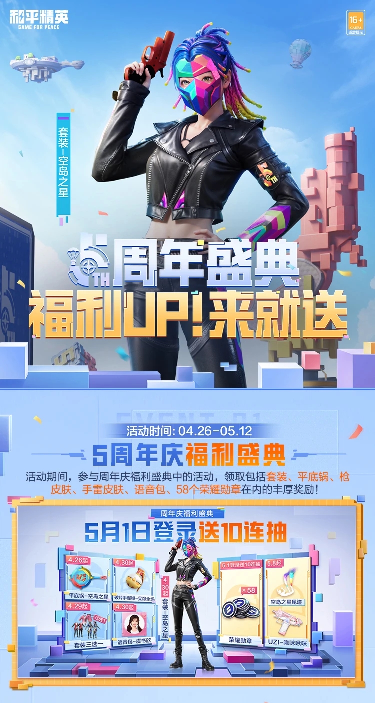 5周年乱斗玩法限时上线!4月26日-5月2日,新玩法5周年乱斗正式启动,一起来参与这个乱斗玩法吧!完成乱斗任务,特种兵们就能拿到5周年的福利碎片和空岛乱斗之王的称号等丰厚奖励!