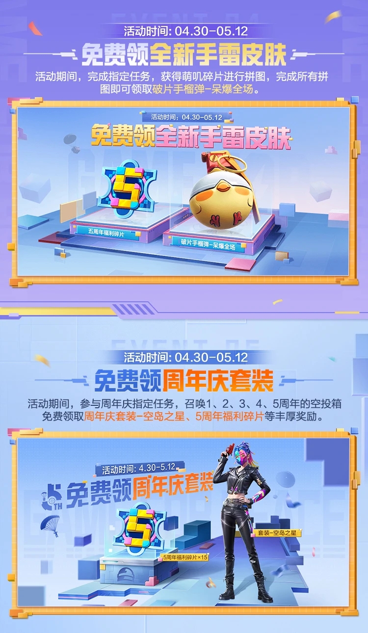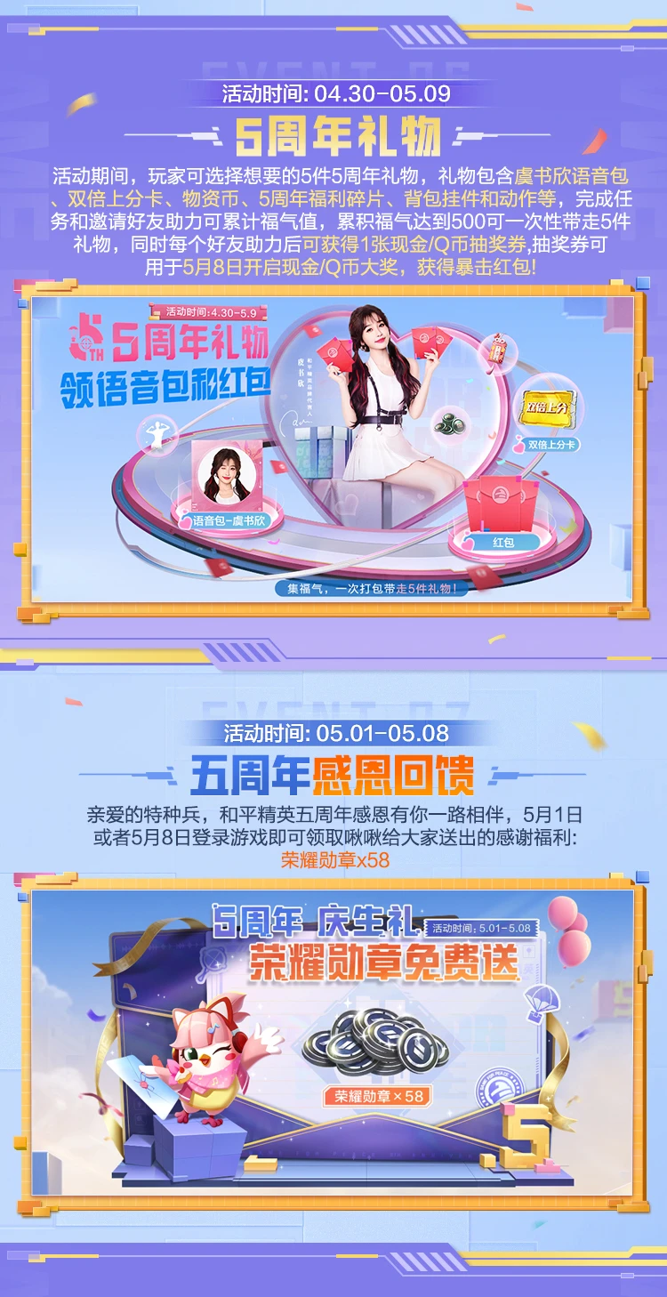 和平精英5周年盛典将在5月1日正式开启!只要在5月1日登录游戏,就能立刻领取58个荣耀勋章!更有手雷皮肤、周年套装、虞书欣语音包、双倍上分卡等超多福利,让特种兵们在5.1冲分的同时,还能捞到满满的惊喜!快来一起看看活动详情吧~