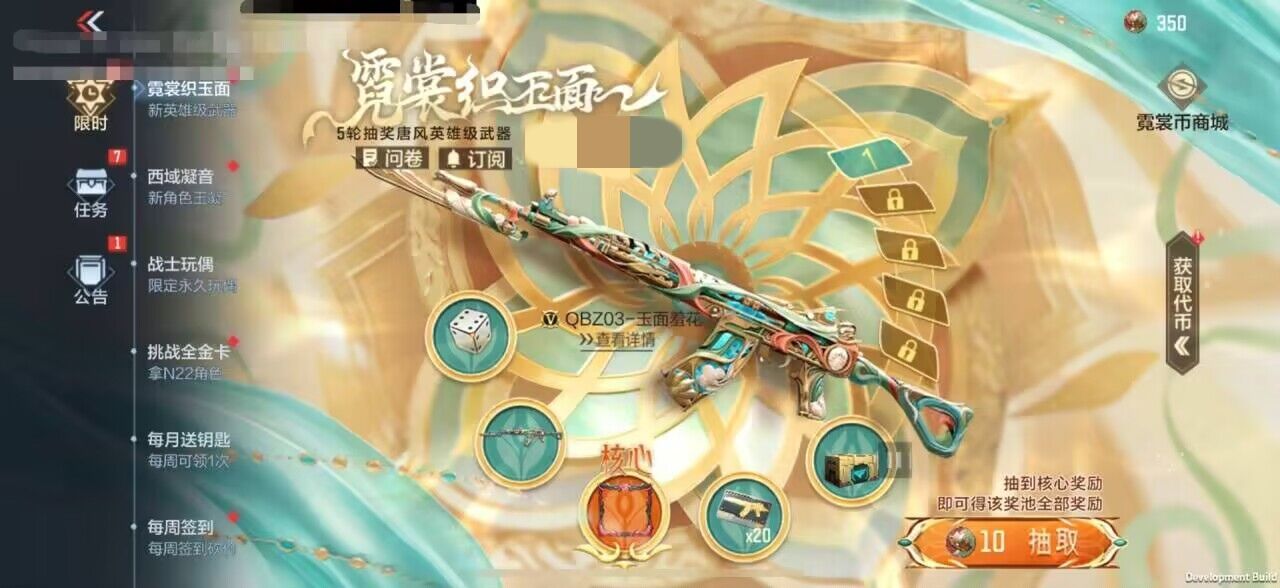 霓裳织玉面活动于4.26开启,至6.9结束,时间持续一个多月,活动模式与以往福利活动相同,活动以抽奖机制为主,共有5个奖池,抽一次需要10枚霓裳币,提前抽到核心奖励后可提前结束该奖池,全部抽完共需要250枚霓裳币。