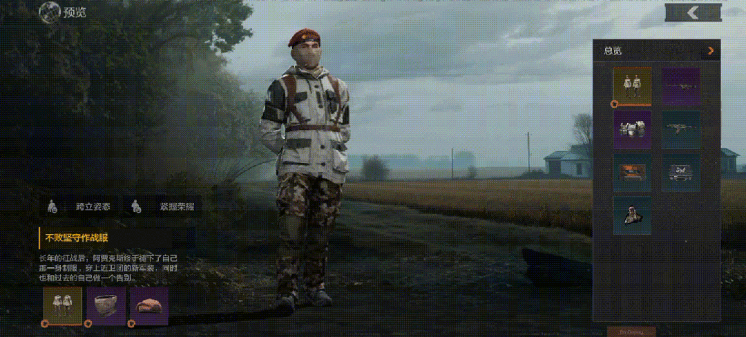 不败坚守作战服由上身的灰白制服和下半身的褐色迷彩长裤组成,关节及易磨损部位以深色加厚面料点缀,外观干练简约,突出实用性。标志性的红色贝雷帽与面巾也作为部件被纳入整套外观之中。