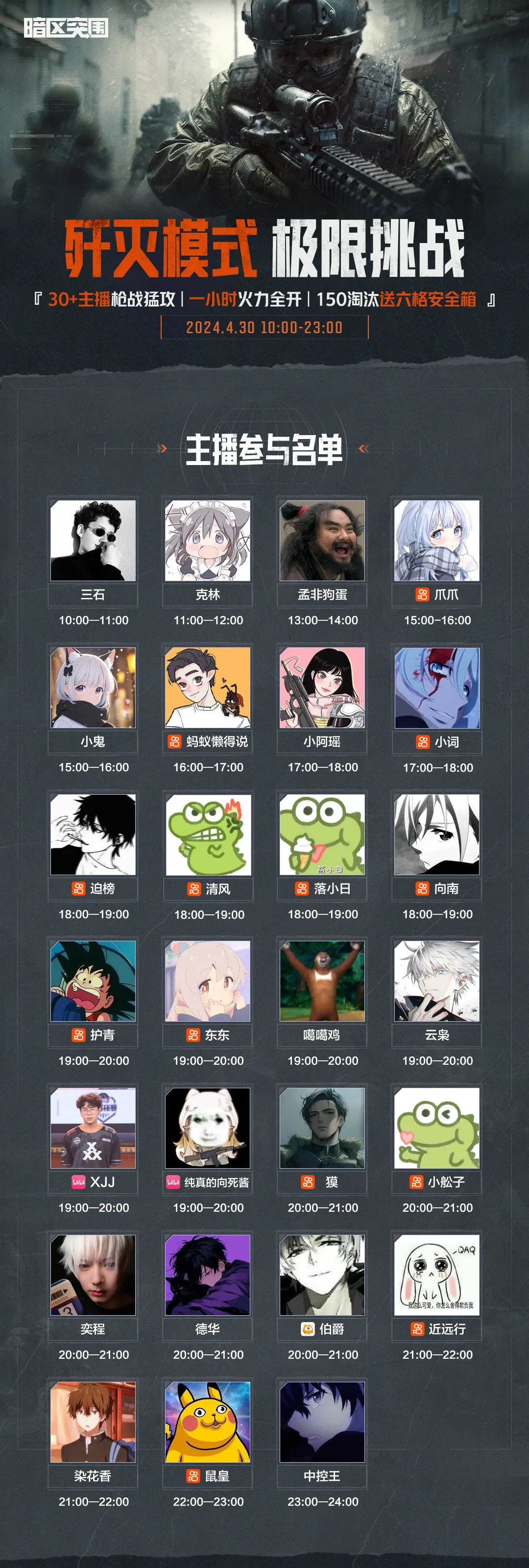 想要抢先沉浸式燃一把?《暗区突围》“歼灭模式极限挑战”直播活动将于4月30日10:00-22:00分时间段挑战,诚邀各位先锋前来围观!30多位暗区超人气主播@染花香、@刘杨杨、@里普、@中控王、@三石 等将陆续亮相,每位主播只有1小时的挑战机会!