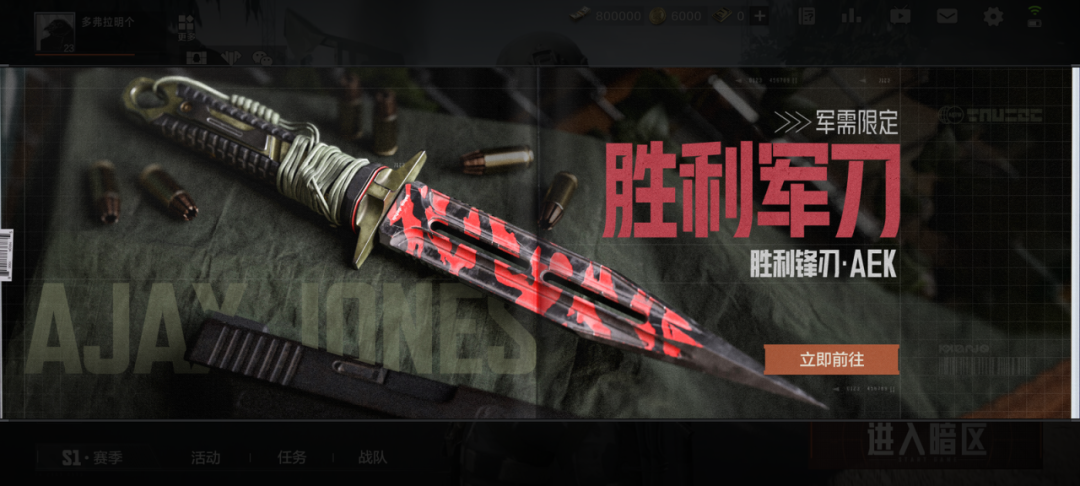 《暗区突围》两大全新主题军需惊喜上线,让先锋轻松拥有阿贾克斯系列套装!“胜利锋刃”主题军需,将让陪伴阿贾克斯多年的近战武器“胜利军刀”重磅登场,还有枪械涂装【胜利锋刃·AEK】等限定外观奖励!