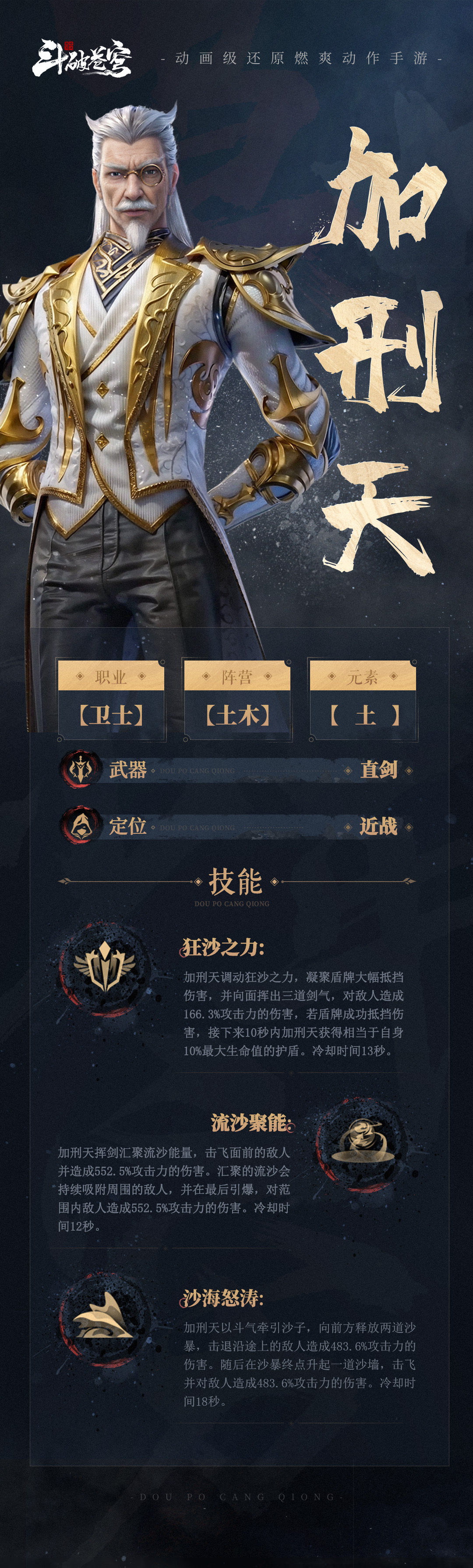 在游戏中,我们还原了加刑天在动漫里不怒自威的形象。技能规划上也延续小说、动漫中土系斗气的设定,采用符合人设的直剑作为武器。