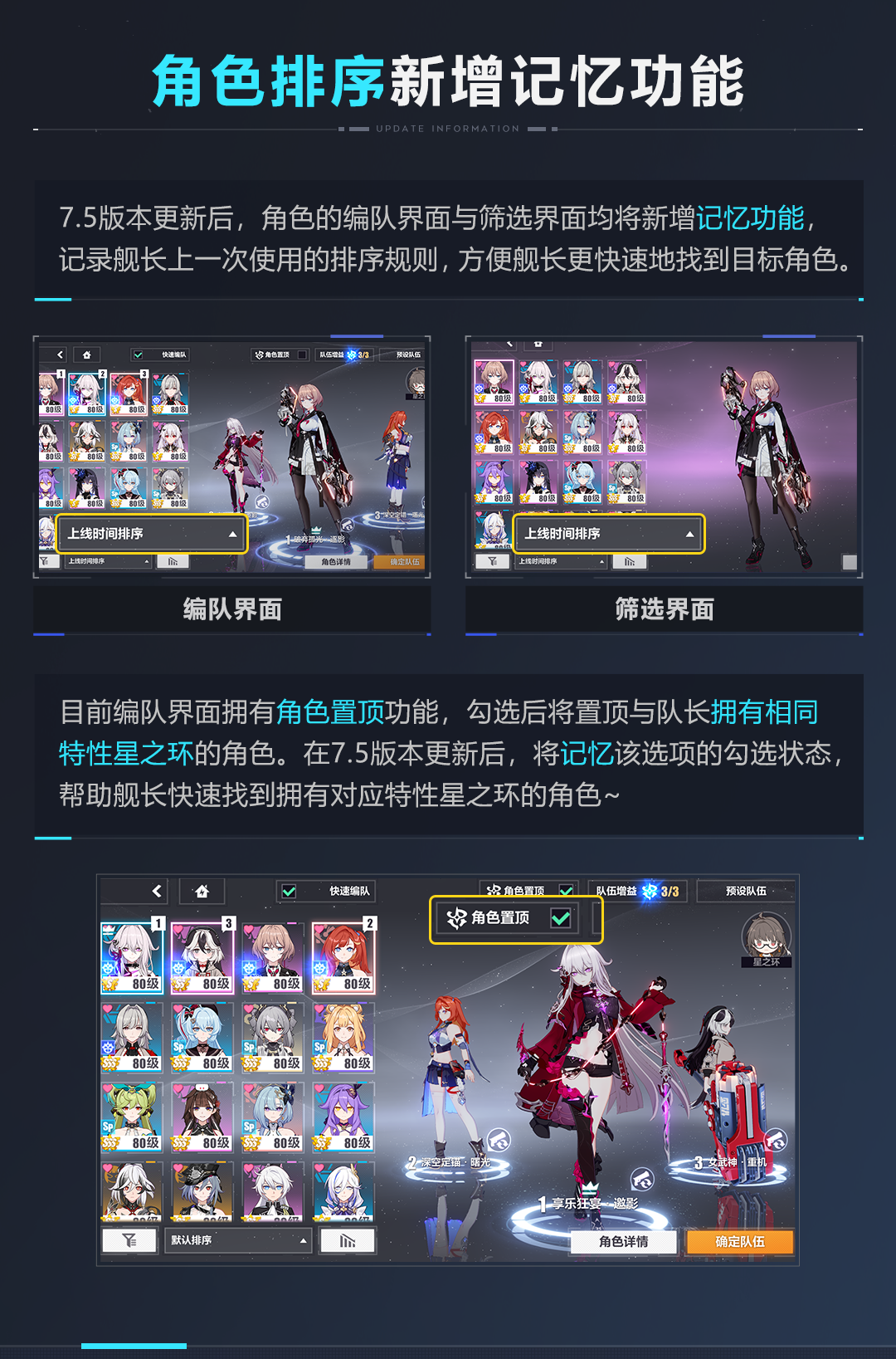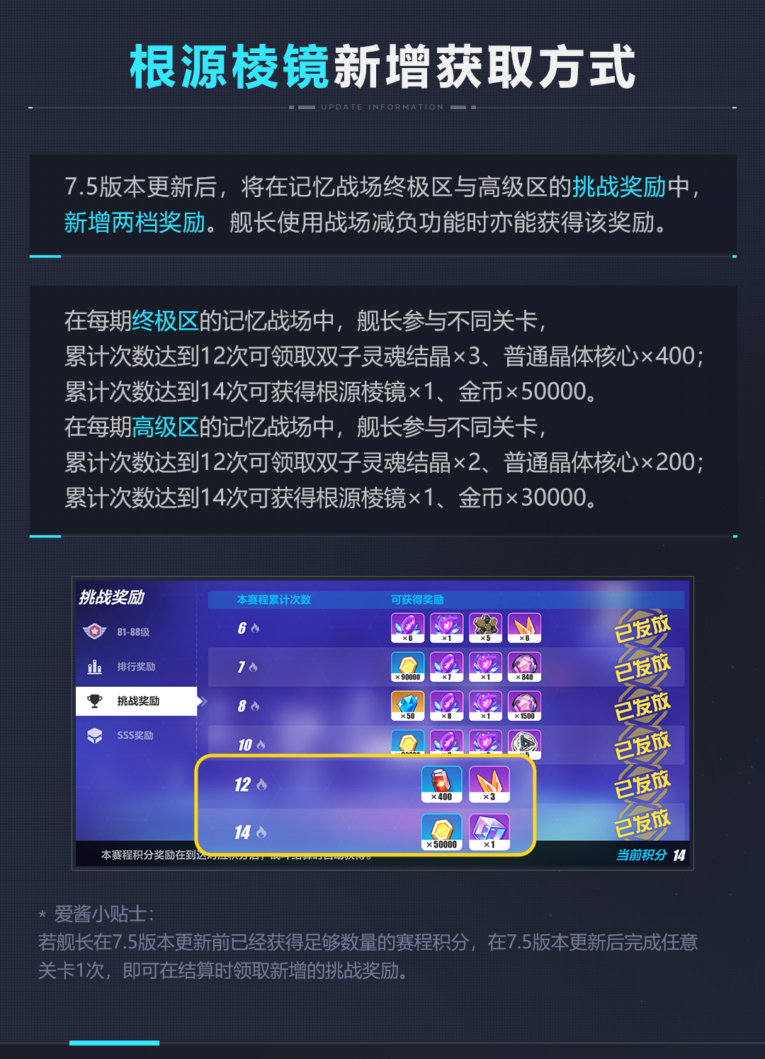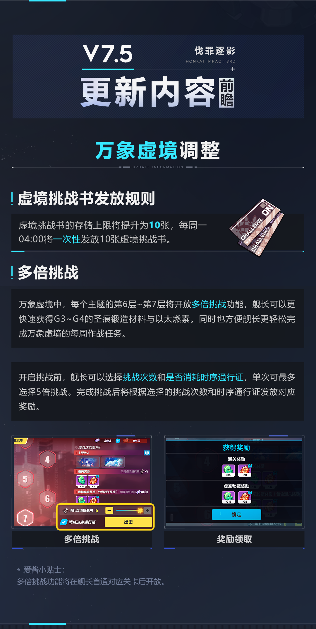 舰长好,在即将到来的7.5版本中,万象虚境将新增多倍挑战功能,助力舰长快速获取圣痕锻造材料。限时累充活动即将开放,累计充值可获得武器直升券、晋升印章等福利回馈。还有服装商城限时折扣、根源棱镜新增获取方式等更新情报为舰长一一呈现。
