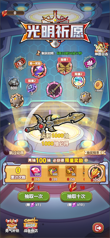 消耗勇士之心道具,可获得魔核和额外奖励,更有机会直接获得背饰六翼凌天神器极光剑等超级大奖,极光剑解锁后,还可额外增加一个新外观形态;