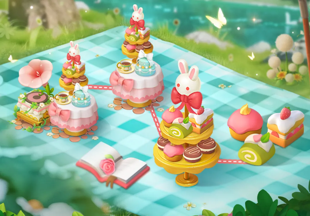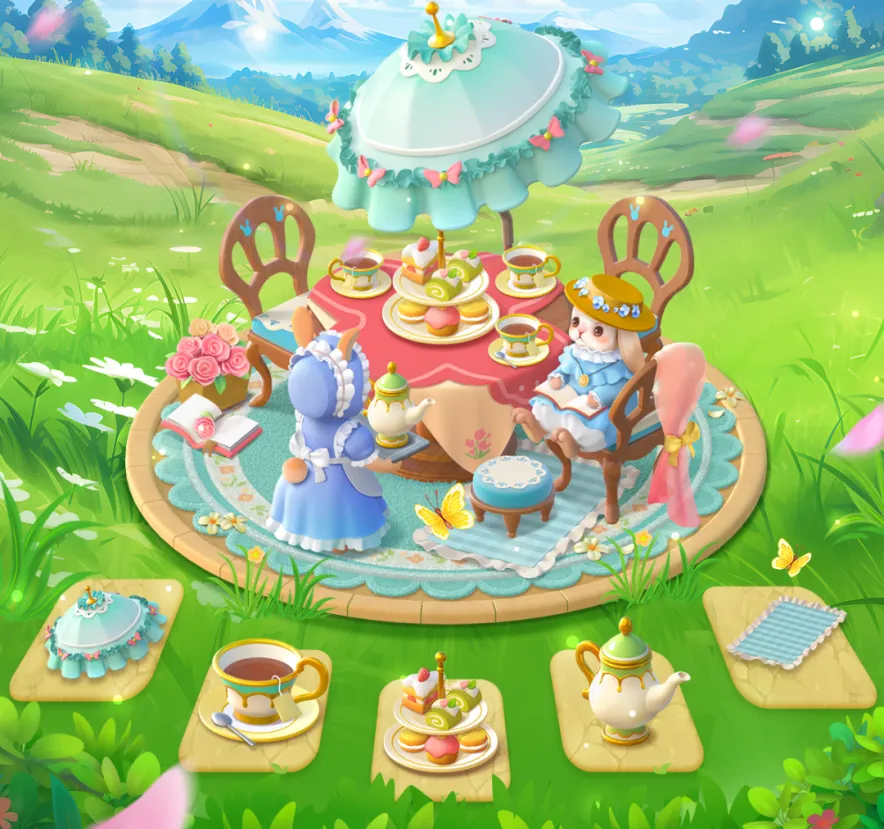 喷泉区上线超精致兔兔下午茶部件【愈系午后】,蝴蝶结小洋伞、宝石绿陶瓷茶具、双层蛋糕塔......任何一个零部件单拎出来都是令人叫绝的精致程度!