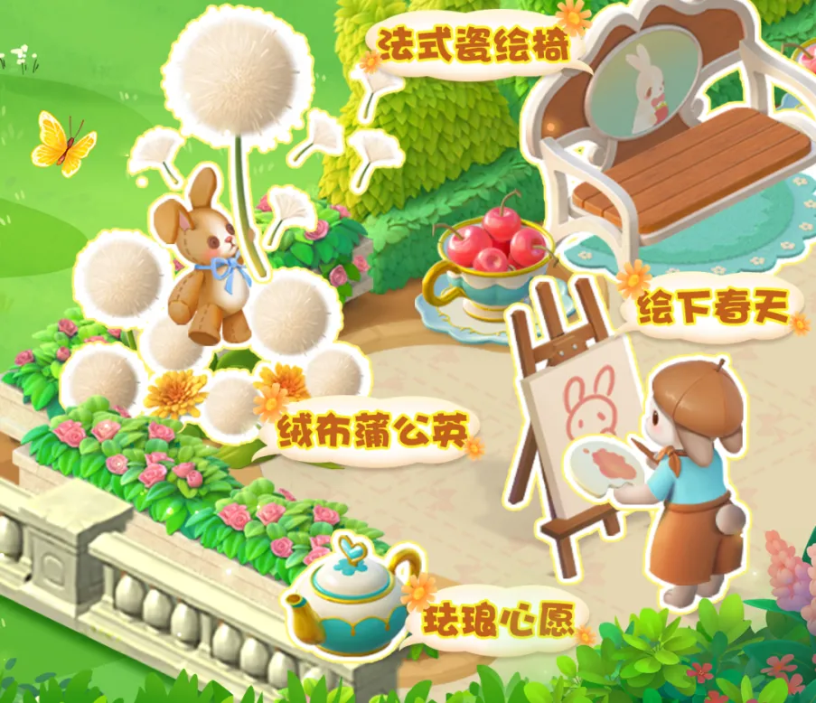 在喷泉区的小角落,一只画家兔兔正在开始它的画作,小小角落也有大大惊喜,绒布蒲公英、法式瓷绘椅、珐琅心愿......超多部件等你解锁~
