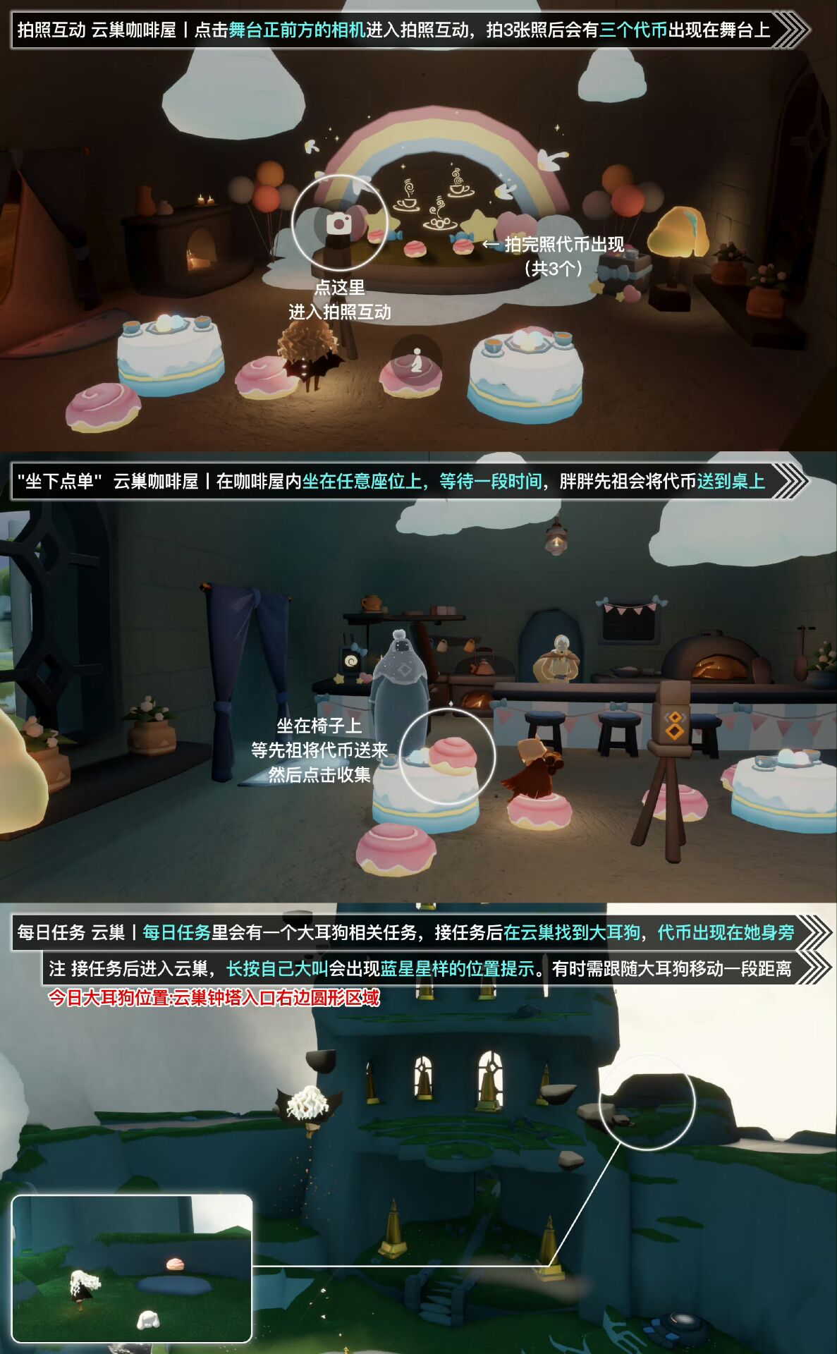 「云巢大耳狗相关」在云巢入口钟塔第二层右边圆形空地找到大耳狗,收取她旁边的肉桂卷代币