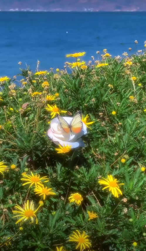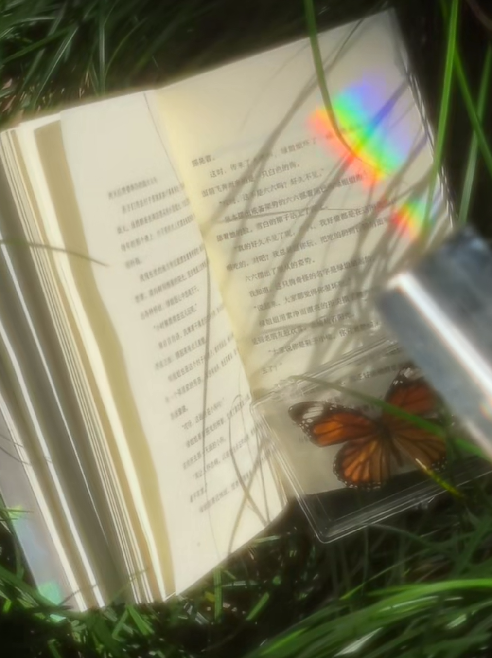 "阳光透过枝叶洒到杂乱艳丽的花上,洒到书上,撒在脸庞上,照耀着一切,飞舞的蝴蝶与嬉笑,在田野上肆意奔跑歌唱,朦朦胧胧中,是梦中的模样"