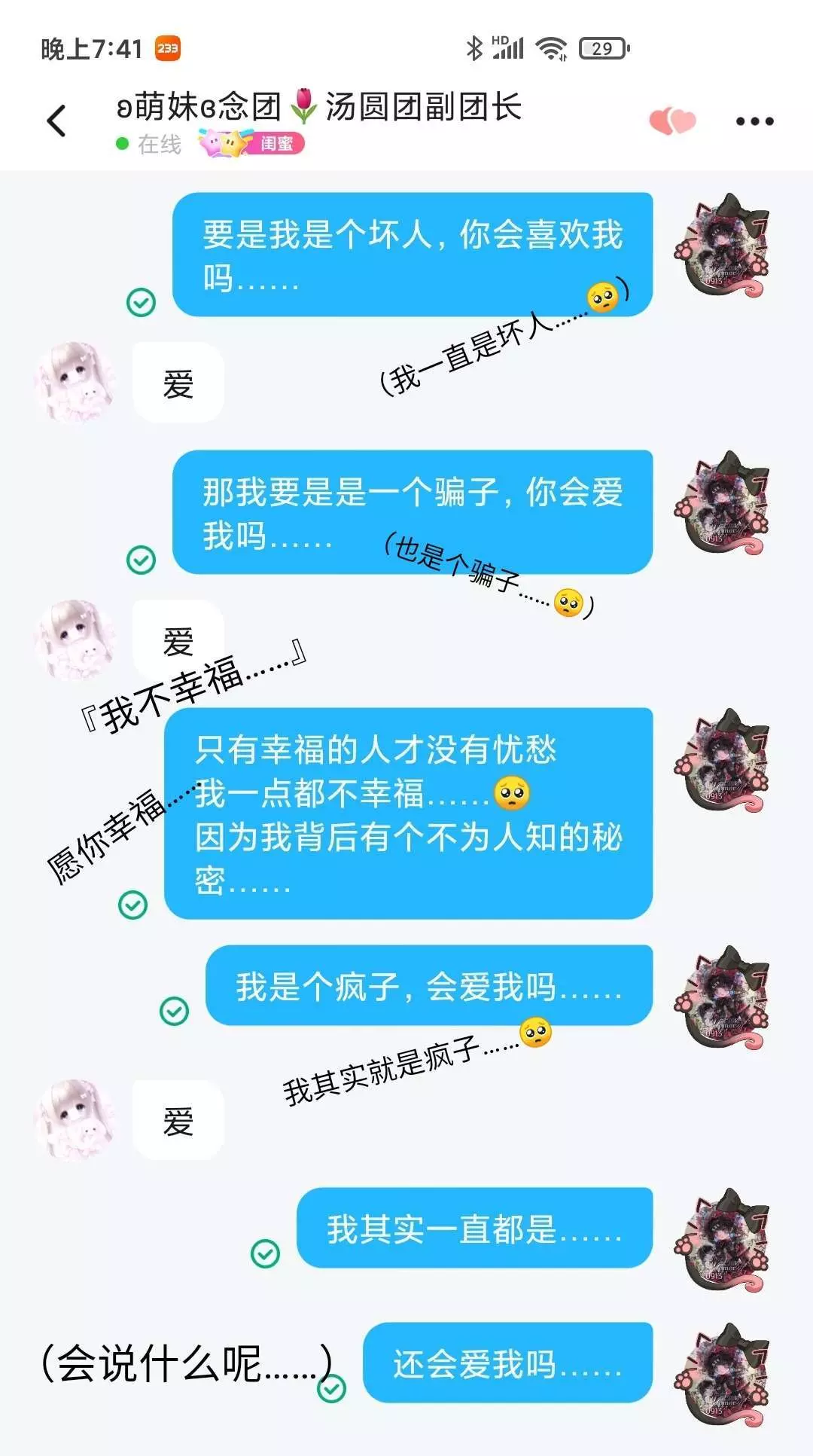 你一句句诚恳的回答让我永远忘不了你……只要你开心幸福就好……忧愁都给我……🥺 (不是剧本)
