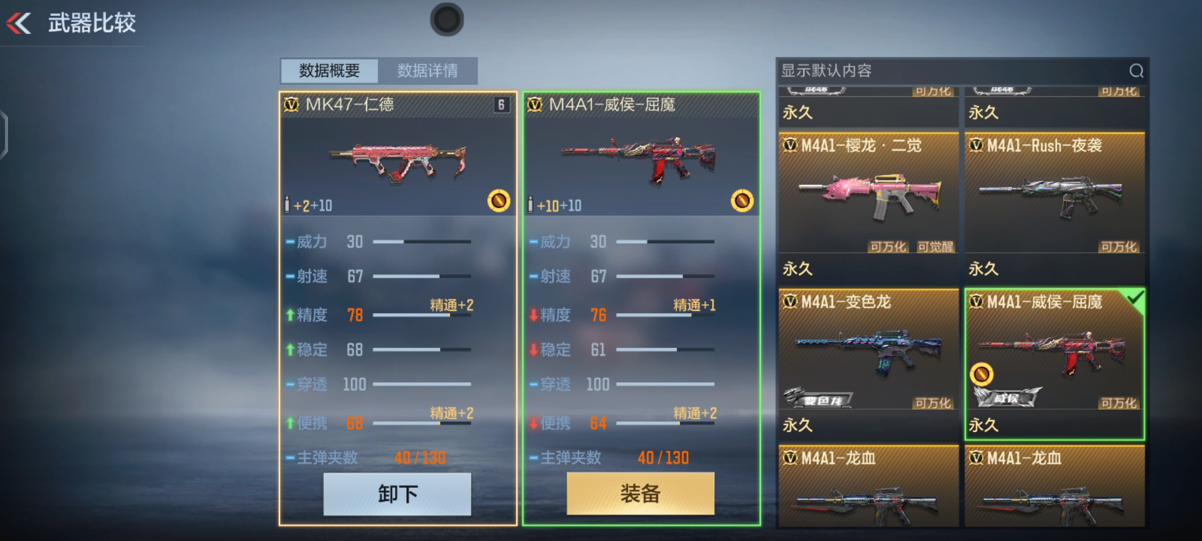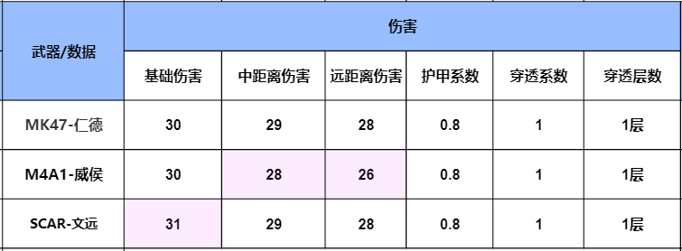 我们在伤害对比中也能看出来,SCAR-文远的伤害要高于其他两款武器,而M4A1-威侯在中距离伤害和远距离伤害上,要略逊于其他两款武器,MK47-仁德除了伤害比SCAR-文远少了一些外,其他的伤害数据和SCAR-文远一致,不过三款武器在护甲系数、穿透层数和穿透系数上一致。