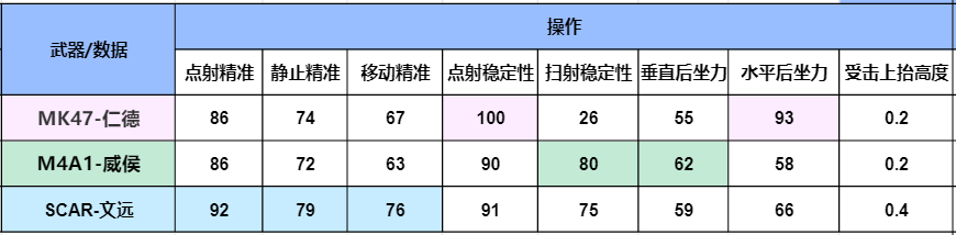 在操作上面三款武器也有一些不同,大家可根据不同枪械的颜色看到每个枪械的优势,MK47-仁德在点射稳定性和水平后坐力上要高于其他两款武器,也就是说点射MK47-仁德是最稳的,二连点射最佳。
