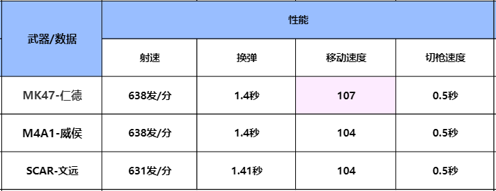 我们从性能对比可以看出来,MK47-仁德在移动速度上要高于其他两款武器,SCAR-文远在射速上要略逊于其他两款武器,除此之外在换弹和切枪速度上,三款武器的属性一致。