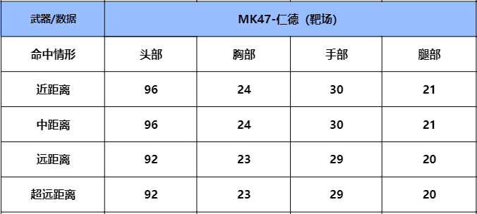 我们先来看下MK47-仁德的伤害测试,这把武器毕竟是T0的三国系列武器,这把武器的距离衰减比较小,所以远距离的伤害也很可观,而且伤害也不错,打中头部的伤害为96左右,打中手部的伤害为30左右,打中胸部的伤害为24左右,打中腿部的伤害为21左右,如果搭配小连发的操作,还是能轻松带走对手的。