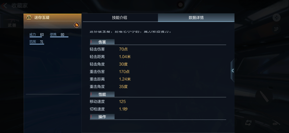 那么问题来了,迷你玉凝在“掌中宝”系列近战武器之中排行第几呢?为了便于大家更直观的查看武器数据,我列了一份表单。另外该武器的轻击头部伤害为180,躯干90,腿部57;重击头部伤害为360,躯干190,腿部121。很常规的轻击两下死,重击一下死,爆头除外。