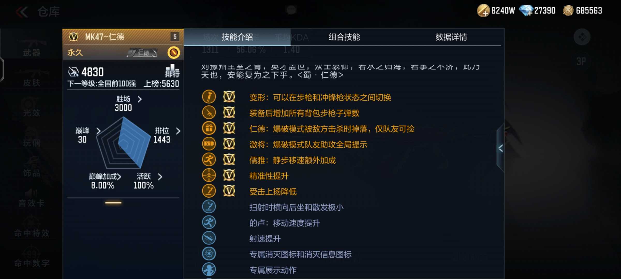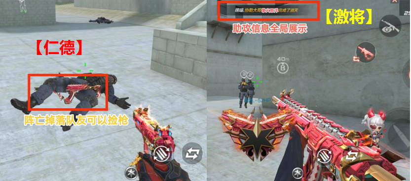 首先看一下这款枪械的属性技能。仁德和激将两项属性可以在爆破模式中为友方提供增益。仁德可以让己方队友拾取被敌人击败后掉落的MK47-仁德,尤其对残局中的狙击玩家提供了更多的选择机会。而激将会将队友助攻击杀的信息全局展示,激励队友再接再厉。