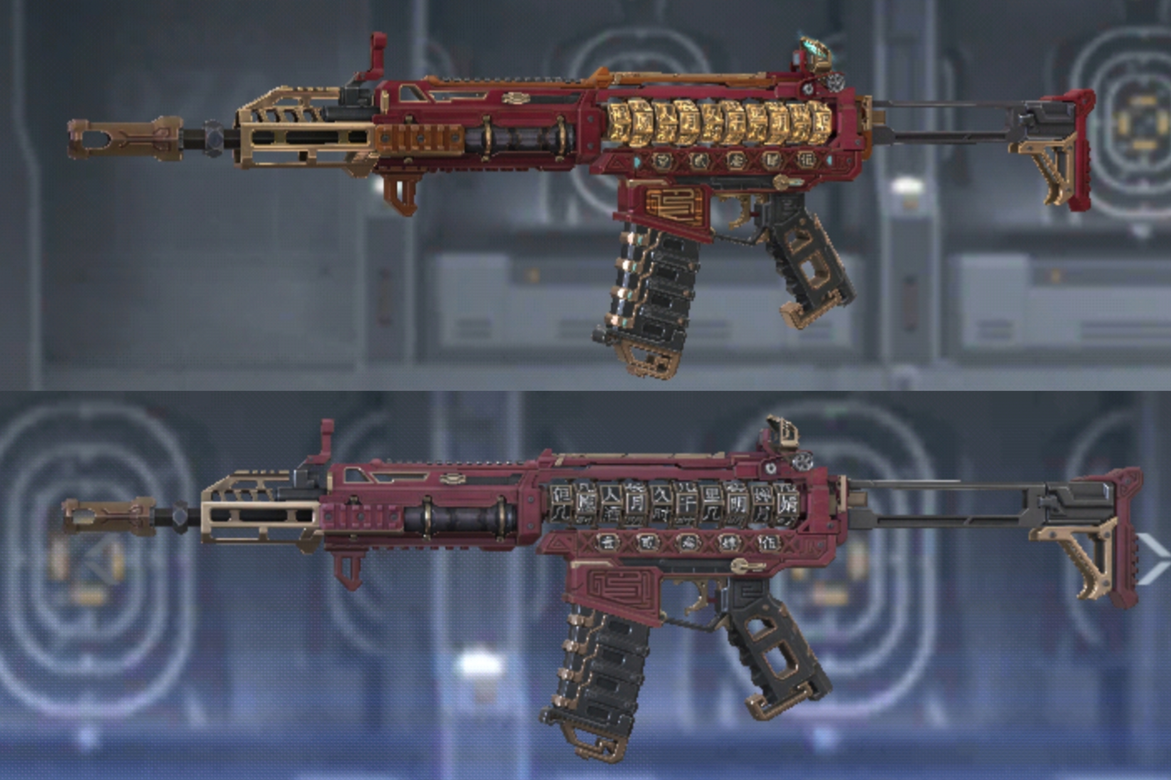 我们将SCAR-印刷术和SCAR-印刷术觉醒放到一起直观对比,首先从整体配色上来看,SCAR-印刷术给人的感觉更加偏暗红,少了些古铜色的点缀,显得更为低调和内敛。而当我们把目光投向SCAR-印刷术觉醒,会发现它在配色上进行了升级,古铜色的点缀使得整把武器看起来更加华丽和亮眼,仿佛是被岁月磨砺出的珍宝。