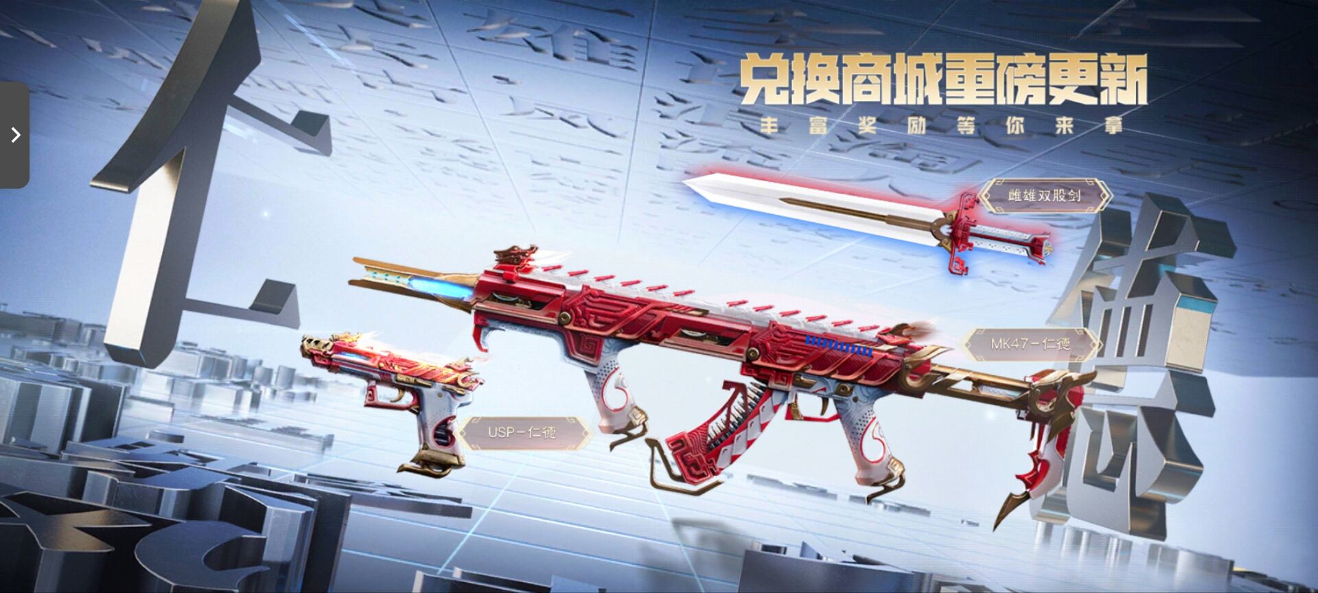 MK47-仁德需要黄金赏金令500级开启兑换,同时本期赏金令中同步返场了仁德套装的近战与副武器,二把武器颜值与性能同在,非常值得推荐!