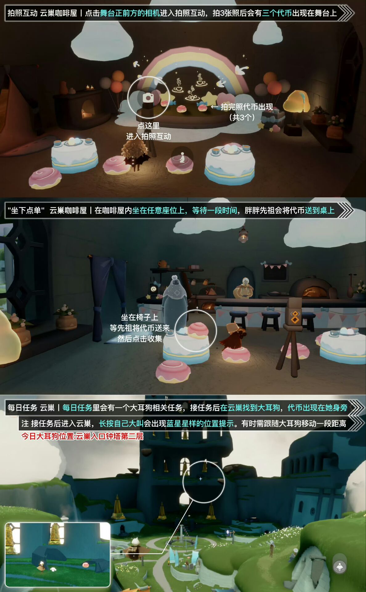 「云巢大耳狗相关」在云巢入口钟塔第二层内找到大耳狗,收取她旁边的肉桂卷代币