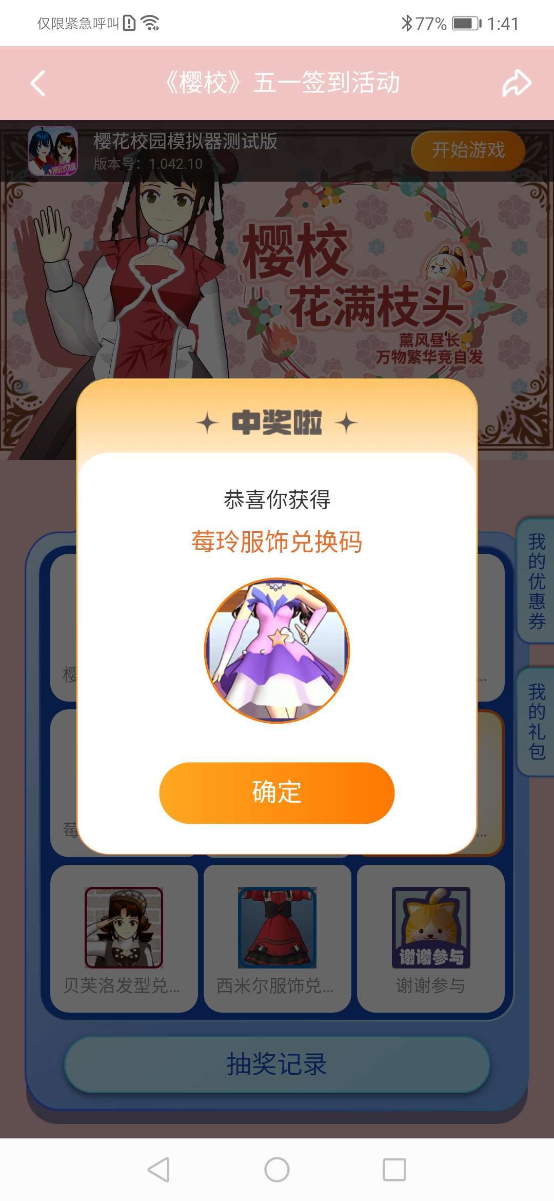 刚刚又抽奖,获得了莓玲服饰兑换码2次,这一次终于能兑换了耶太好了😭😭😘😘💖💖💖🎉🎉