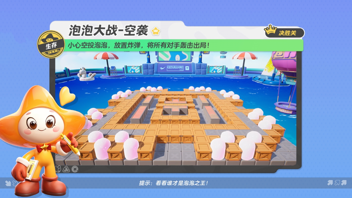 在【空袭】地图中,星宝们需要利用木箱里炸出的道具增强对战能力,躲避地面放置的泡泡炸弹和从天而降的空袭泡泡,在平台上存活到最后,才能取得最终的胜利哦!
