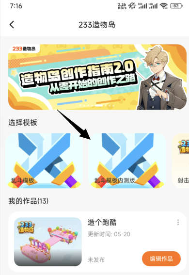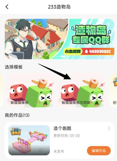 进入建造模板页面,选择乱斗模板内测版或躲猫猫模板内测版